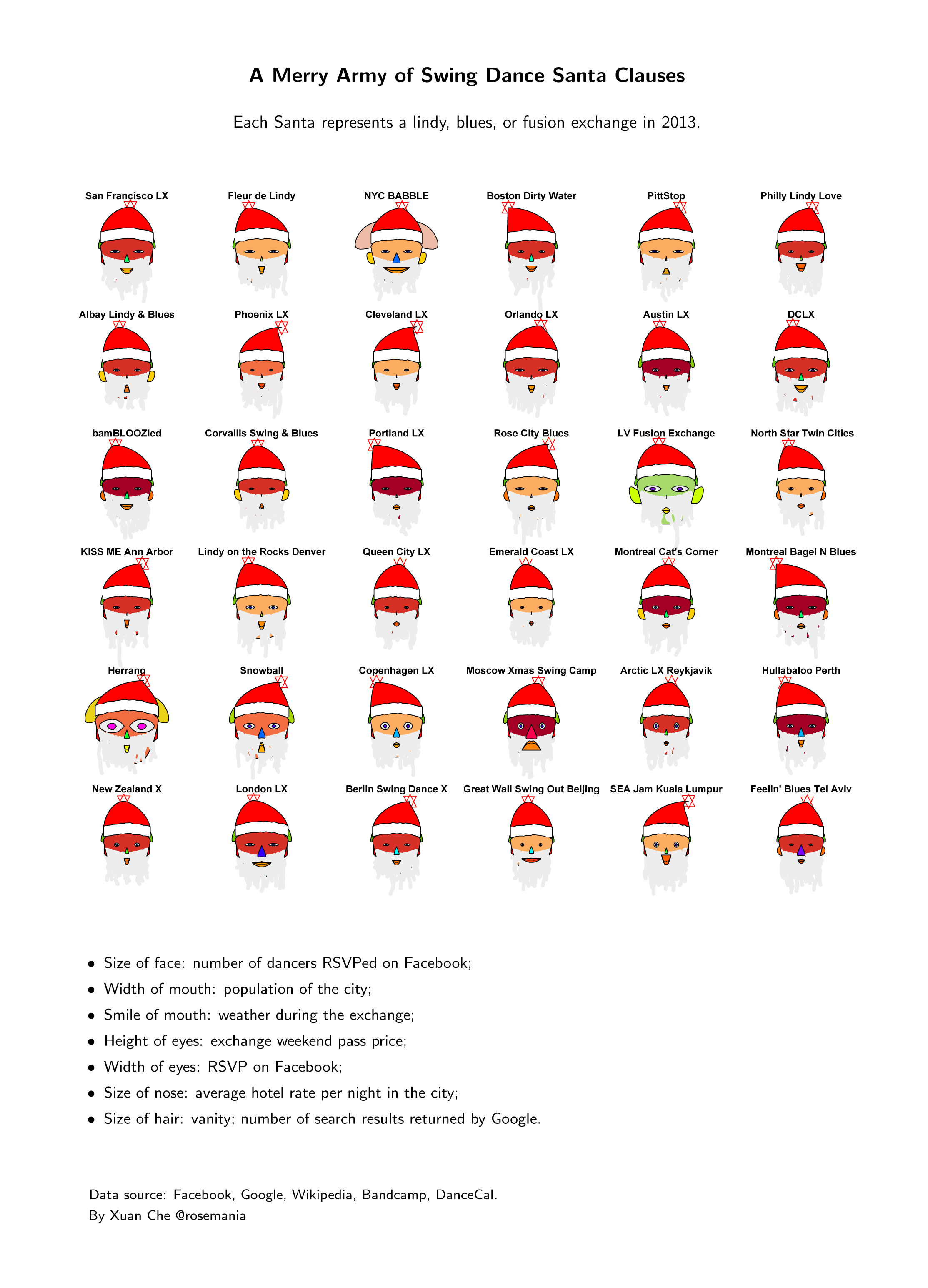 Chernoff faces of world lindy, blues, and fusion exchanges. Made in R.